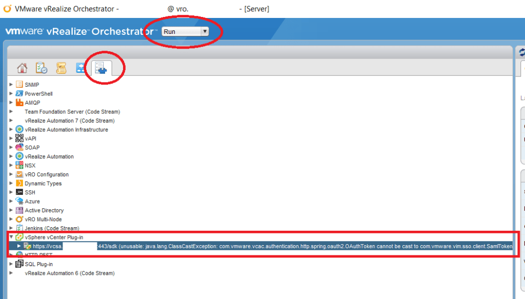To check login to the vRO client and navigate to XXX, you will see the “(unusable: java.lang.ClassCastException: com.vmware.vcac.authentication.http.spring.oauth2.OAuthToken cannot be cast to com.vmware.vim.sso.client.SamlToken” under the